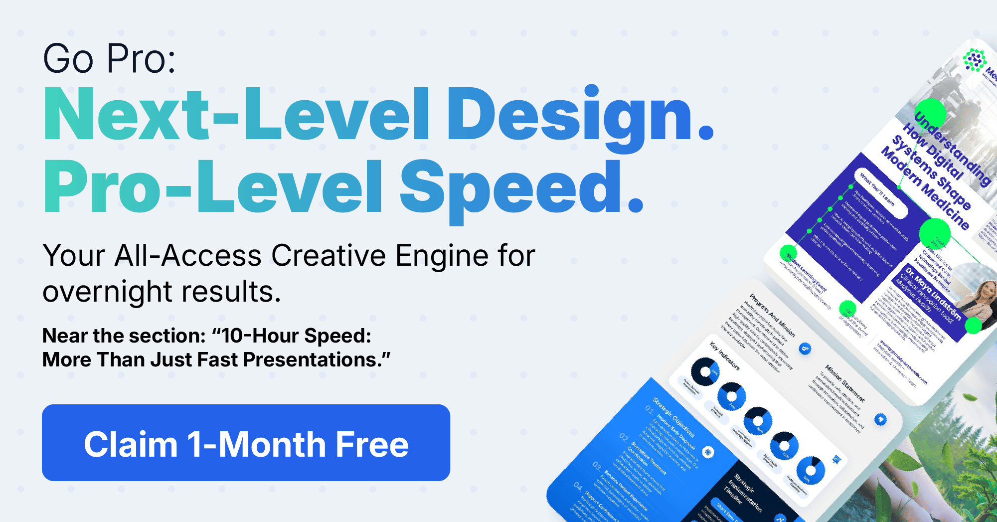 - Plug-and-Play Creative Department: For companies where a full-time designer isn't feasible, Pro acts as your internal team. In addition to slides, you now have access to