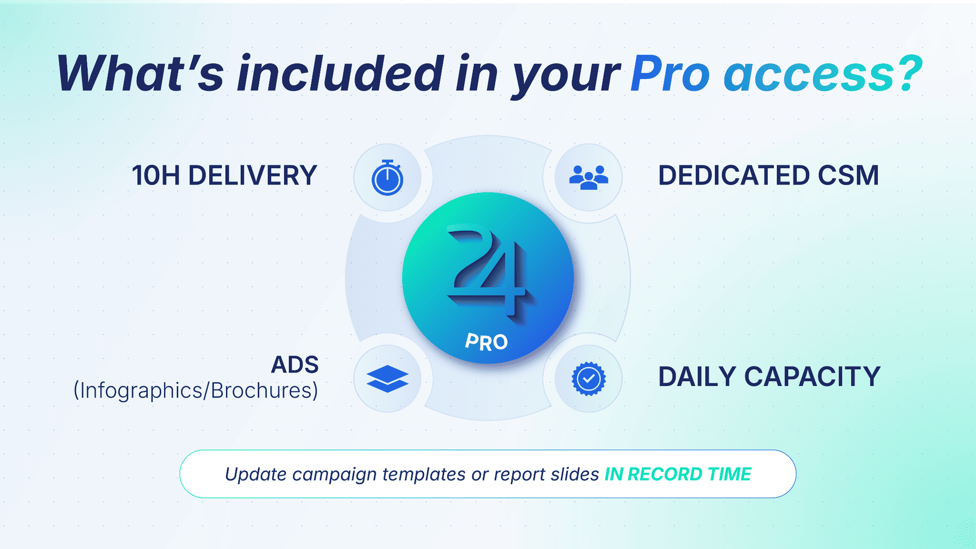 - Introducing Your All-Access Creative Engine: But what if we could make it even better? How the 24Slides Pro subscription model moves beyond simple orders to provide permanent infrastructure, including a dedicated CSM and Full-Funnel Design (ADS).